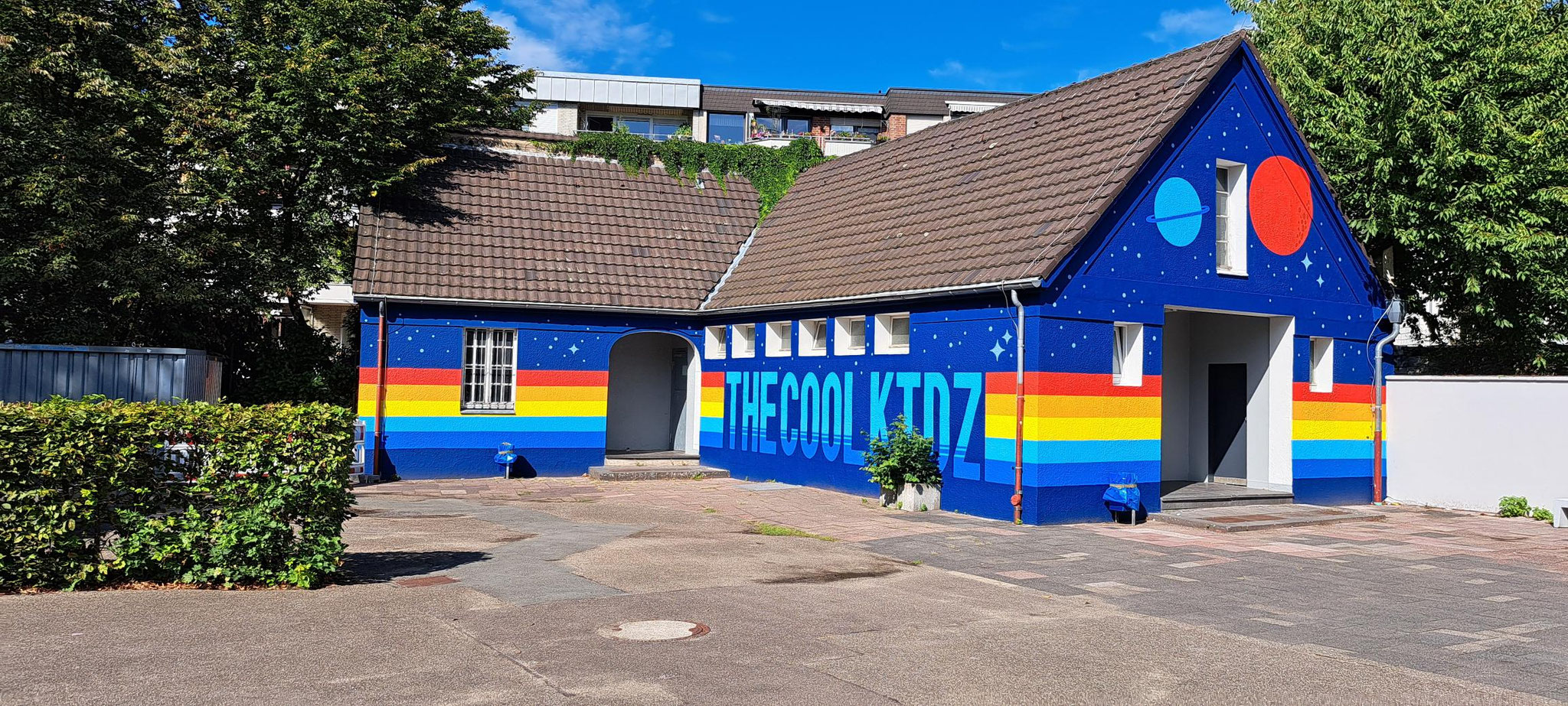 In der ersten Woche der Sommerferien gestalteten fünf Schülerinnen und Schüler eine neue Fassade für das Toilettenhaus auf dem Schulhof. Unter der Leitung des freischaffenden Graffiti-Künstlers Christian Dünow und unserer Schulsozialarbeiterin Mareen Schwartmann arbeiteten Yousef Alyousef (8b), Zahra-Esme Stoppel (8b), Sieveen Othman (8c), Soraya Afkir (9c) und Martin Lukas (9a) eine Woche lang an einer neuen Gestaltung.