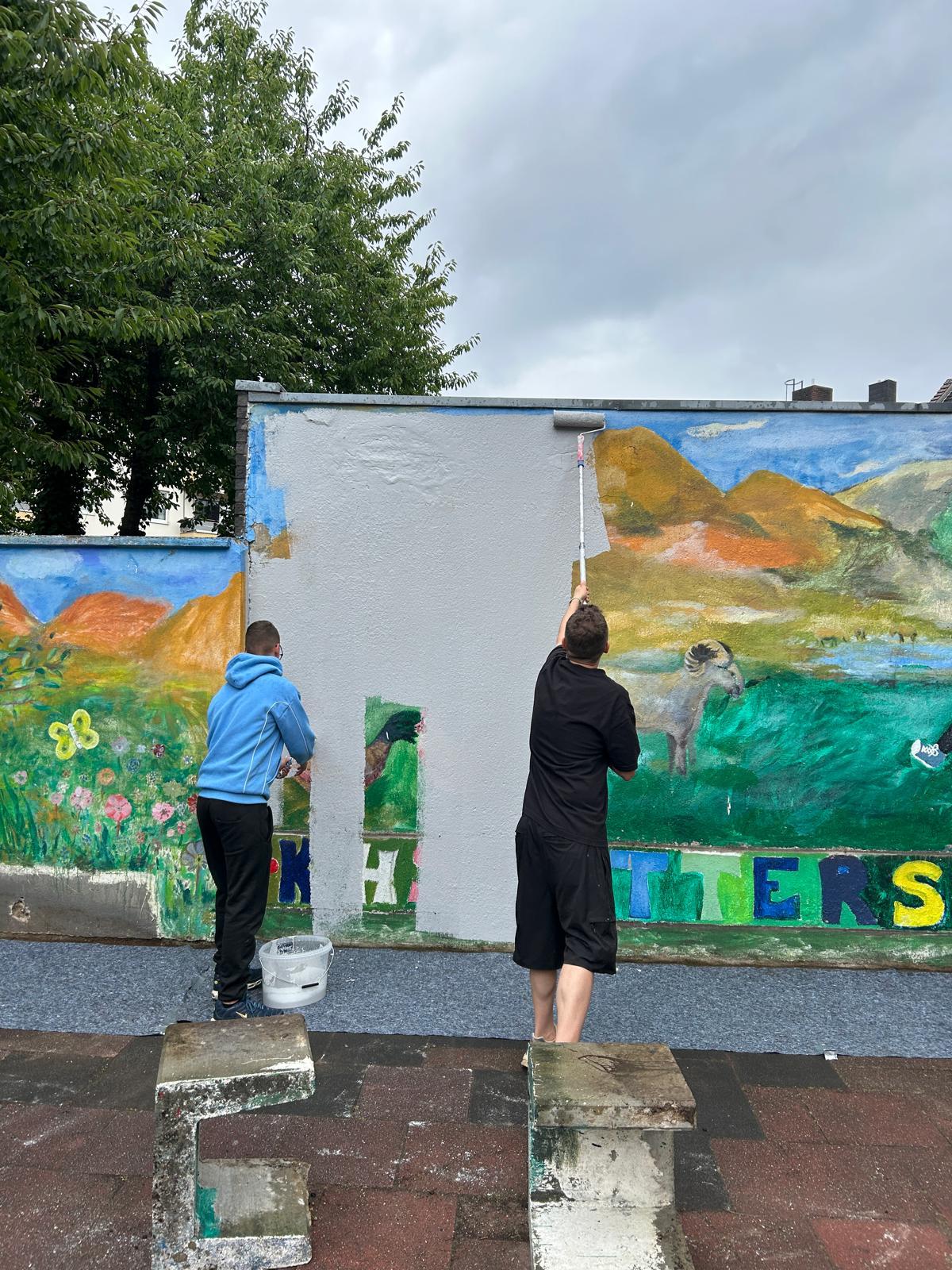 Zuerst erstellte die kreative Gruppe mehrere künstlerische Entwürfe. Dann ging es an die Arbeit: Gemeinschaftlich wurde das Material im Baumarkt gekauft und die Außenwände einheitlich grau vorgestrichen. Nachdem sich das Team für einen künstlerischen Entwurf entschieden hatte, ging es mit der eigentlichen Gestaltung in den Farben Blau, Rot, Orange und Gelb los. Für das leibliche Wohl sorgte Frau Schwartmann mit leckerem Frühstück und Mittagessen.