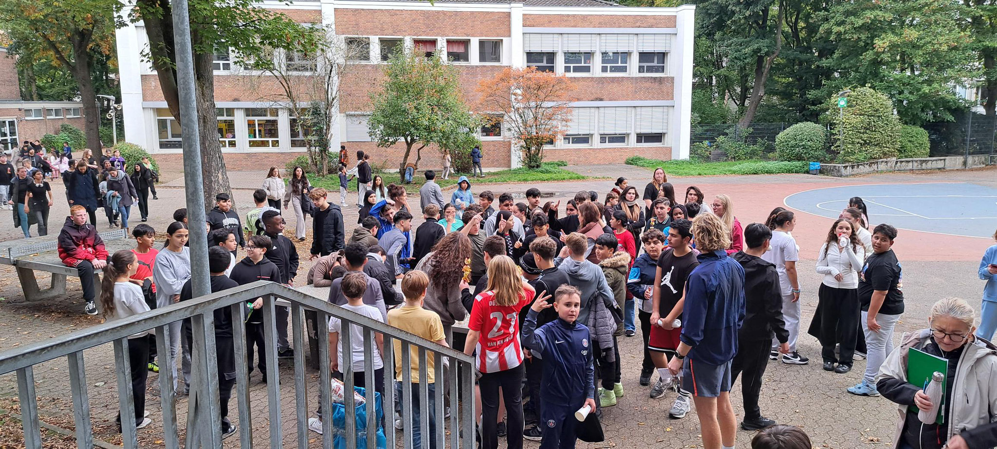 Am Weltkindertag, 20.09.2023, trafen sich die Klassen 5a, 5b, 6a und 6b mit den Schulsozialarbeiterinnen Frau Schwartmann, Frau Maaßen und Frau Ixkes auf dem Schulhof, um den Kinderschutz-Song zu rappen. Alle waren mit viel Enthusiasmus und Freude dabei.