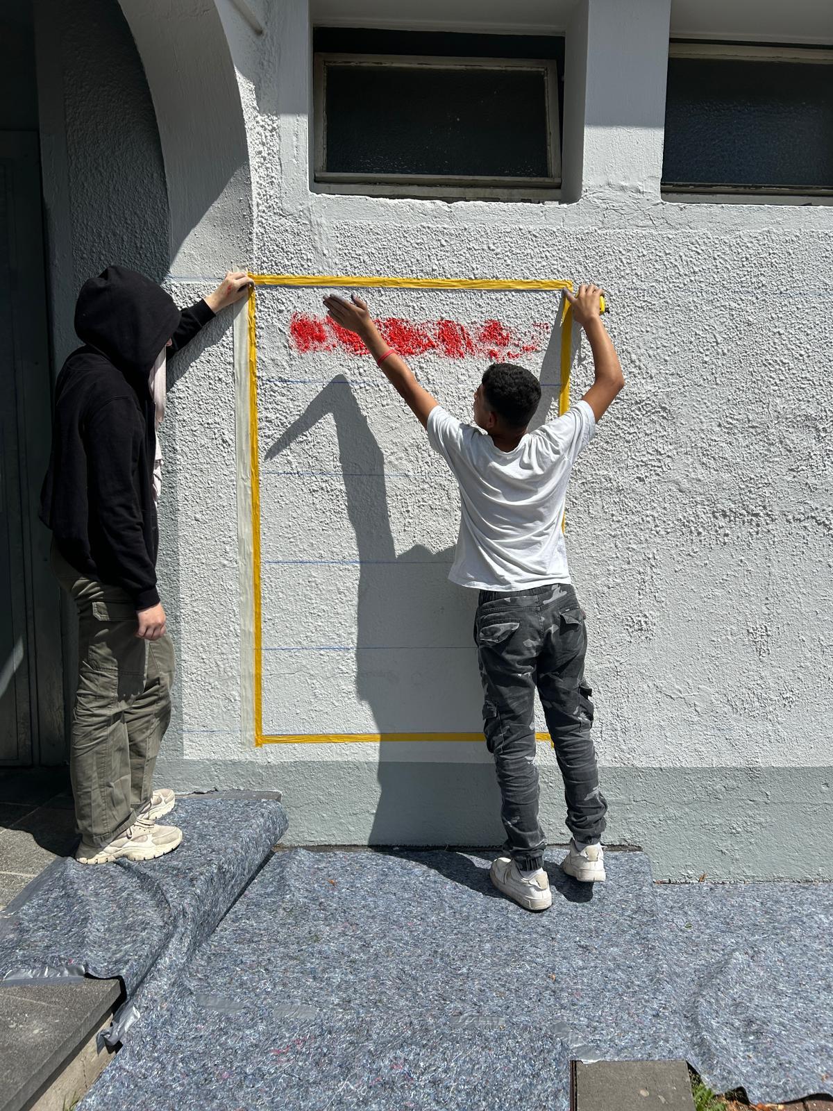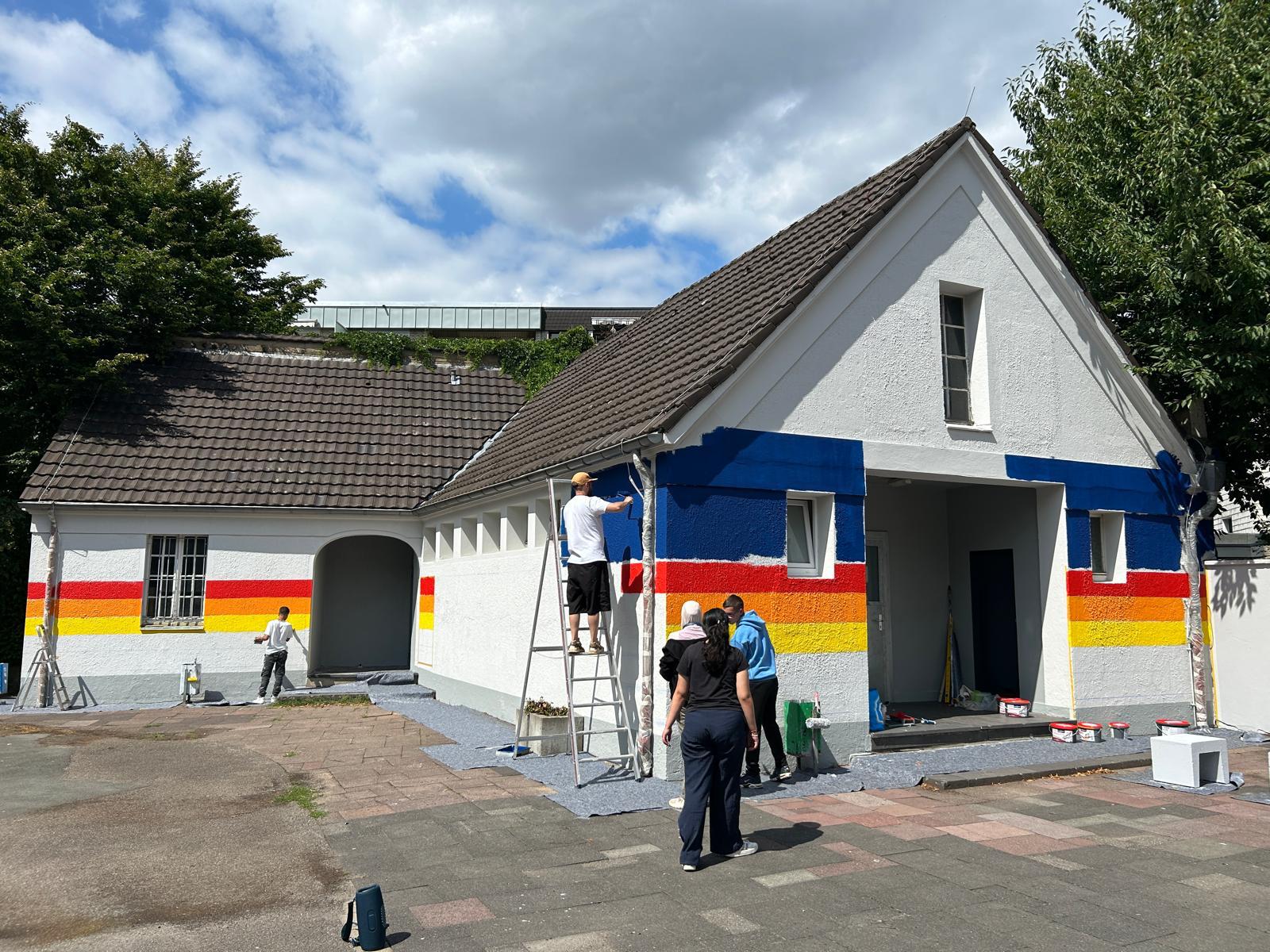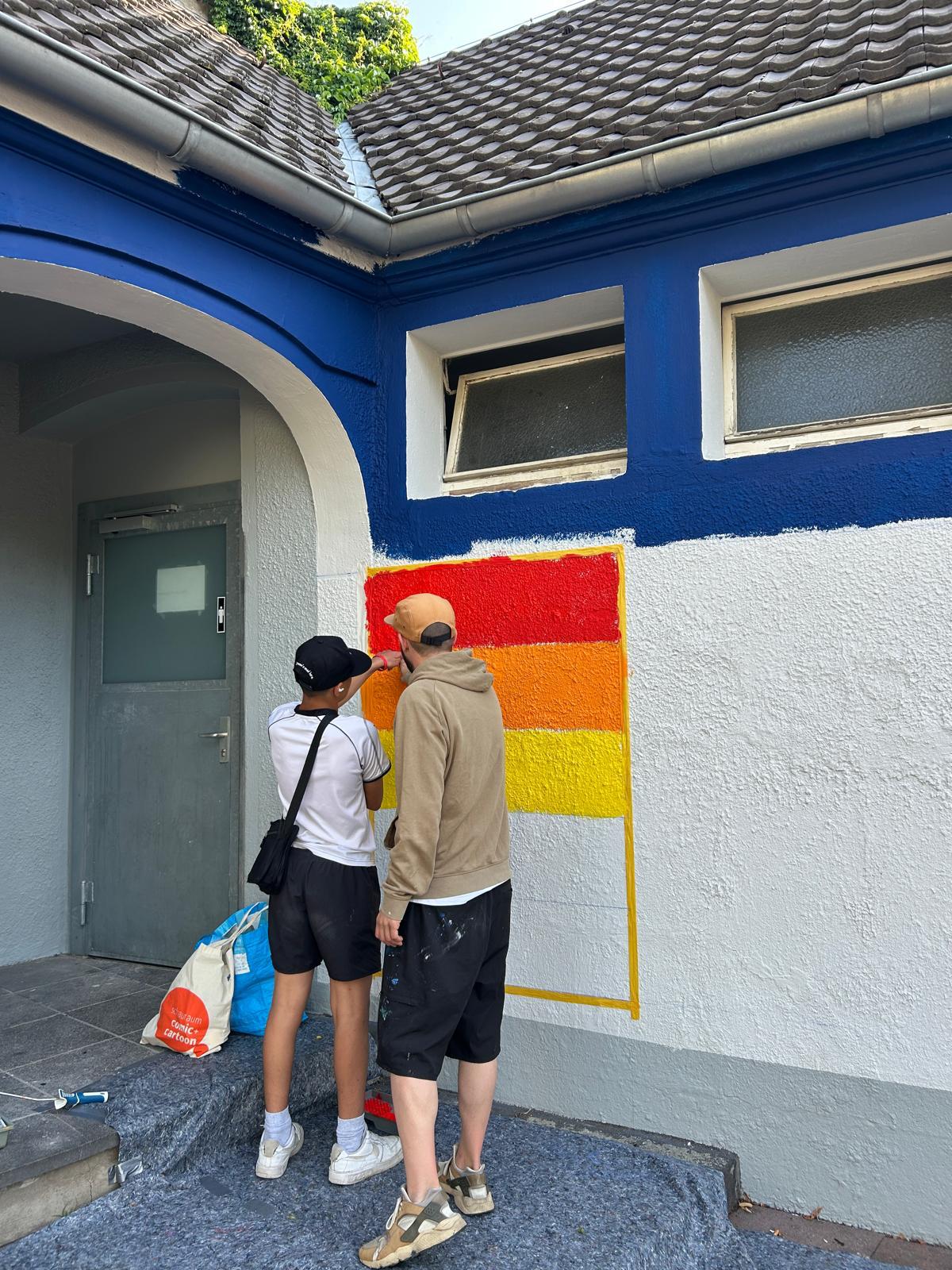 Zuerst erstellte die kreative Gruppe mehrere künstlerische Entwürfe. Dann ging es an die Arbeit: Gemeinschaftlich wurde das Material im Baumarkt gekauft und die Außenwände einheitlich grau vorgestrichen. Nachdem sich das Team für einen künstlerischen Entwurf entschieden hatte, ging es mit der eigentlichen Gestaltung in den Farben Blau, Rot, Orange und Gelb los. Für das leibliche Wohl sorgte Frau Schwartmann mit leckerem Frühstück und Mittagessen.