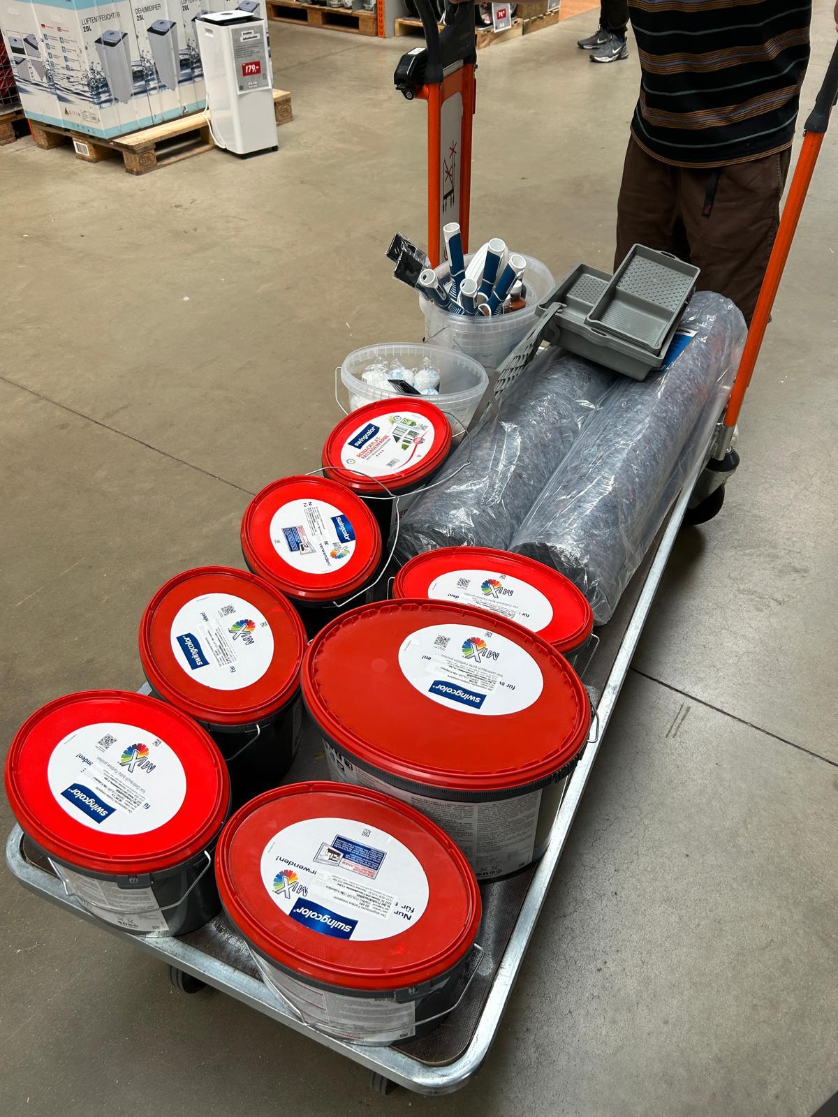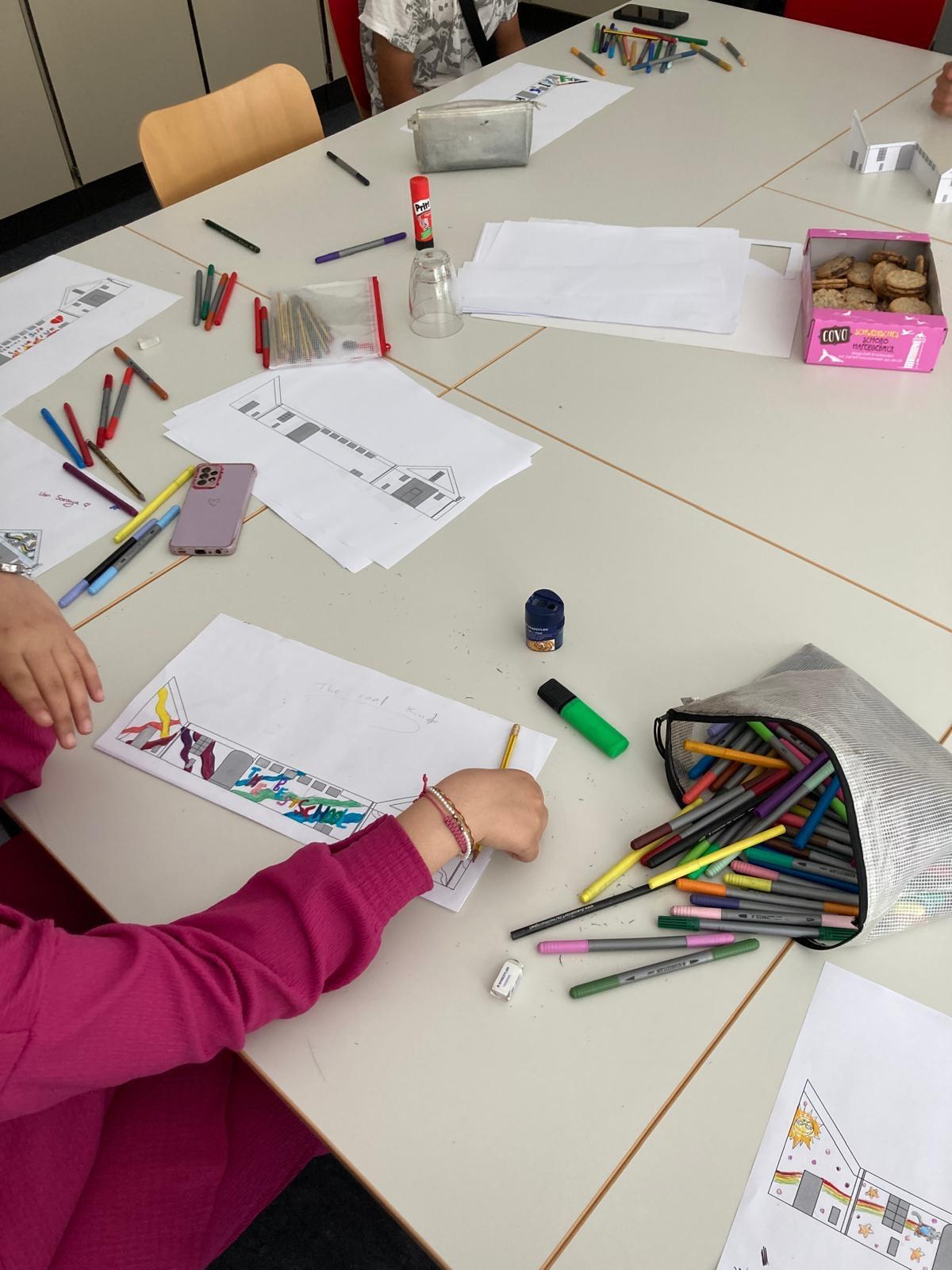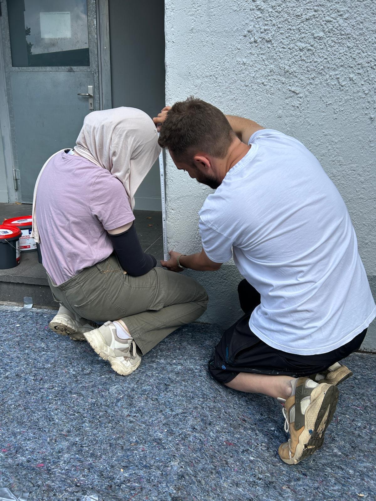 Zuerst erstellte die kreative Gruppe mehrere künstlerische Entwürfe. Dann ging es an die Arbeit: Gemeinschaftlich wurde das Material im Baumarkt gekauft und die Außenwände einheitlich grau vorgestrichen. Nachdem sich das Team für einen künstlerischen Entwurf entschieden hatte, ging es mit der eigentlichen Gestaltung in den Farben Blau, Rot, Orange und Gelb los. Für das leibliche Wohl sorgte Frau Schwartmann mit leckerem Frühstück und Mittagessen.